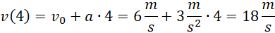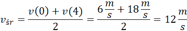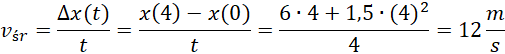 Definicja szybkości średniej mówi, że jest to stosunek drogi przebytej do czasu ruchu. Aby obliczyć średnią arytmetyczną, obliczamy prędkość w momencie początkowym i po 4 sekundach. Wartości liczbowe odczytujemy z równania ruchu.
