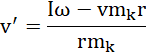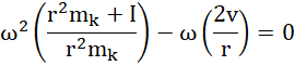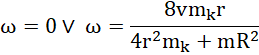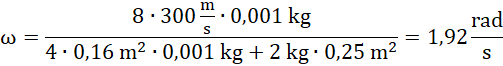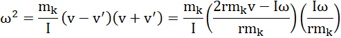 Pamiętaj, podczas zderzenia sprężystego zachowane są energia oraz moment pędu. Zapisz więc równości wynikające z zasady zachowania energii (energia kinetyczna ruchu postępowego kuli jest równa sumie energii kinetycznej ruchu obrotowego tarczy i energii kinetycznej ruchu postępowego kuli z inną prędkościom) oraz z zasady zachowania momentu pędu. W tak otrzymanym układzie równań musisz wyliczyć dwie niewiadome – prędkość po odbiciu się od tarczy oraz prędkość kątową. Zacznij od prędkości kuli po odbiciu się (wykorzystaj równość wynikającą z zasady zachowania momentu pędu). Otrzymane wyrażenie wstaw do pierwszej równości i wykonaj konieczne przekształcenia (staraj się ułatwiać sobie liczenie, np. zamiast podnosić prędkość v’ do kwadratu, rozpisz ją ze wzoru skróconego mnożenia v2 – v’2).