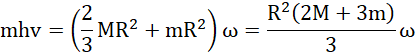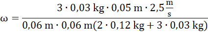 Na układ nie działa żaden zewnętrzny moment siły, więc z zasady zachowania momentu pędu, moment pędu przed przyklejeniem się plasteliny i zaraz po nim jest taki sam. Początkowy moment pędu to moment pędu lecącej plasteliny (kula pozostaje w spoczynku). Końcowy moment pędu to z kolei suma momentu pędu kuli i momentu pędu plasteliny (traktowana jako punkt metrykalny). Z otrzymanej równości wyznacz i wylicz prędkość kątową.