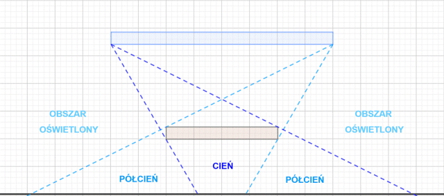Wykreślając kierunki biegów promieni świetlnych, wyznaczamy obszar, do którego one nie dochodzą (cień), oraz do których dochodzą częściowo (półcień).