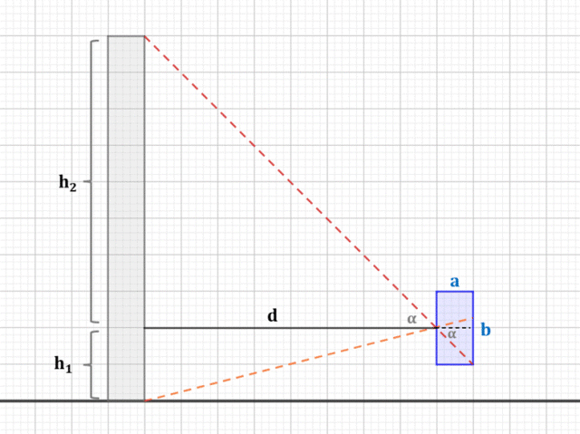 Po skonstruowaniu biegów promieni korzystamy z podobieństwa dwóch trójkątów – powstałego wewnątrz kamery (o bokach długości: a i 0,5b) oraz zawartego między odległością (d) oraz górną wysokością bloku (h2). Stosunki długości ich boków są sobie równe. Dokonując przekształceń, wyznaczamy odległość między blokiem a kamerą.