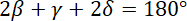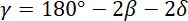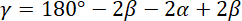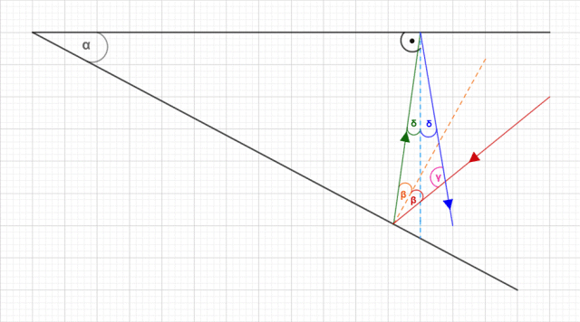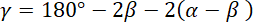 Wykreślając kierunki biegów promieni świetlnych, korzystamy z własności trójkątów. W trójkącie ograniczonym przez wszystkie trzy promienie kąty mają miary γ, 2β oraz 2δ. Korzystając z wyniku z podpunktu a) wiemy, że δ = α - β. Uzależniając wszystkie kąty od danych: α i β, wyznaczamy γ.