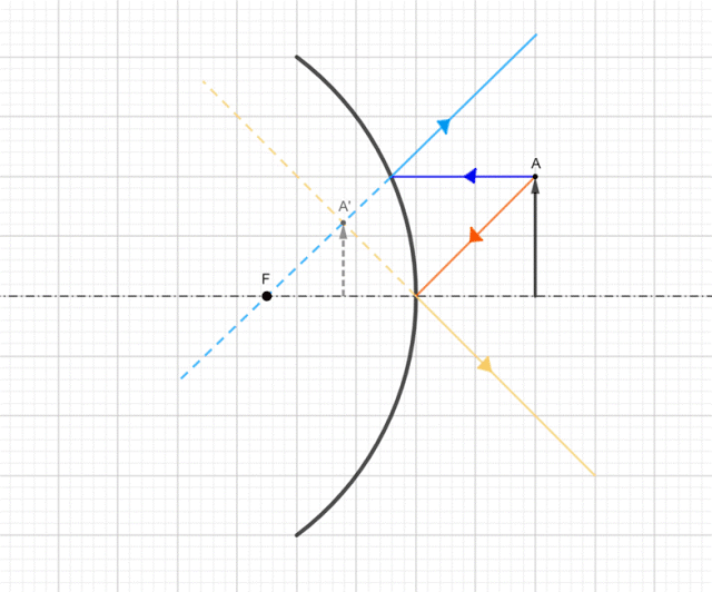 Aby wyznaczyć obraz strzałki, z jej wierzchołka (A) prowadzimy dwa promienie. Pierwszy biegnie równolegle do osi optycznej, a po odbiciu jego przedłużenie przechodzi przez ognisko. Drugi pada na wierzchołek zwierciadła na osi optycznej i odbija się pod tym samym kątem. Punkt przecięcia przedłużeń promieni odbitych wyznaczy wierzchołek obrazu (A’).