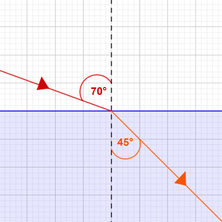 Skonstruuj promień padający pod kątem 70° na granicę powietrze-woda oraz jego promień załamany.