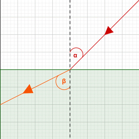 Zgodnie z prawem załamania światła, podczas przejścia z ośrodka o mniejszej gęstości (powietrze) do ośrodka gęstszego (szkło) kąt załamania (β) jest mniejszy od kąta padania (α).