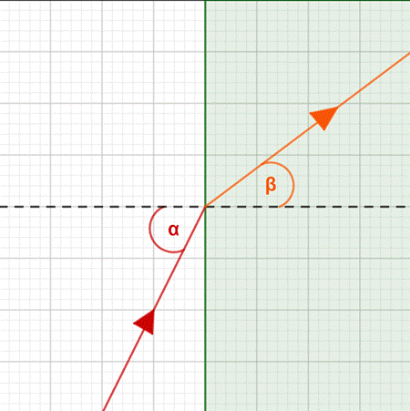 Zgodnie z prawem załamania światła, podczas przejścia z ośrodka o mniejszej gęstości (powietrze) do ośrodka gęstszego (szkło) kąt załamania (β) jest mniejszy od kąta padania (α).