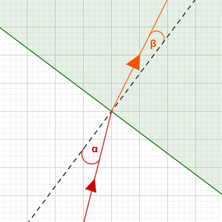 Zgodnie z prawem załamania światła, podczas przejścia z ośrodka o mniejszej gęstości (powietrze) do ośrodka gęstszego (szkło) kąt załamania (β) jest mniejszy od kąta padania (α).