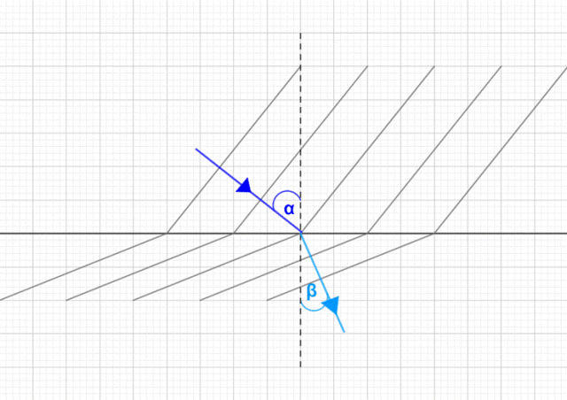 ). Wówczas, zgodnie z prawem załamania, w pierwszym ośrodku prędkość fali jest większa niż w drugim, czyli u góry jest woda głębsza.
