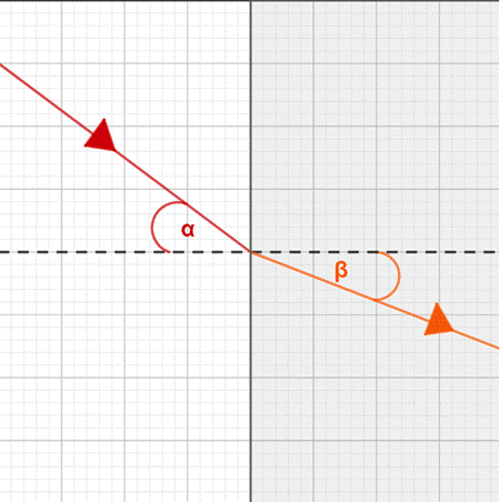 Zgodnie z prawem załamania światła, gdy podczas przejścia z pierwszego ośrodka do drugiego kąt załamania (β) jest mniejszy od kąta padania (α), to drugi ośrodek jest gęstszy.