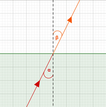 Zgodnie z prawem załamania światła podczas przejścia z ośrodka o większej gęstości (szkło) do ośrodka rzadszego (powietrze) kąt załamania (β) jest większy od kąta padania (α). W tym przypadku promień nie uległ załamaniu.