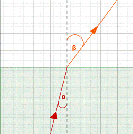 Zgodnie z prawem załamania światła, podczas przejścia z ośrodka o większej gęstości (szkło) do ośrodka rzadszego (powietrze) kąt załamania (β) jest większy od kąta padania (α).