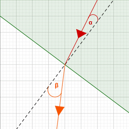 Zgodnie z prawem załamania światła podczas przejścia z ośrodka o większej gęstości (szkło) do ośrodka rzadszego (powietrze) kąt załamania (β) jest większy od kąta padania (α).