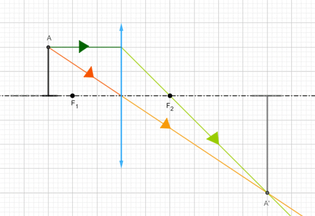 Aby wyznaczyć obraz gwoździa z jej wierzchołka, prowadzimy dwa promienie. Pierwszy biegnie równolegle do osi optycznej, a po załamaniu przechodzi przez ognisko. Drugi biegnie przez środek soczewki, nie ulegając załamaniu. Następnie rysujemy przedłużenia promieni załamanych, których punkt przecięcia wyznacza obraz wierzchołka gwoździa (A’).