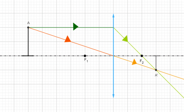 Aby wyznaczyć obraz gwoździa z jej wierzchołka, prowadzimy dwa promienie. Pierwszy biegnie równolegle do osi optycznej, a po załamaniu przechodzi przez ognisko. Drugi biegnie przez środek soczewki, nie ulegając załamaniu. Punkt przecięcia tych promieni wyznacza obraz wierzchołka gwoździa (A’).