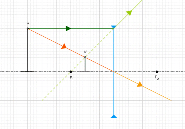 Aby wyznaczyć obraz gwoździa z jej wierzchołka, prowadzimy dwa promienie. Pierwszy biegnie równolegle do osi optycznej, a po załamaniu biegnie tak, że jego przedłużenie przechodzi przez ognisko pozorne. Drugi biegnie przez środek soczewki, nie ulegając załamaniu. Punkt przecięcia tych promieni wyznacza obraz wierzchołka gwoździa (A’).