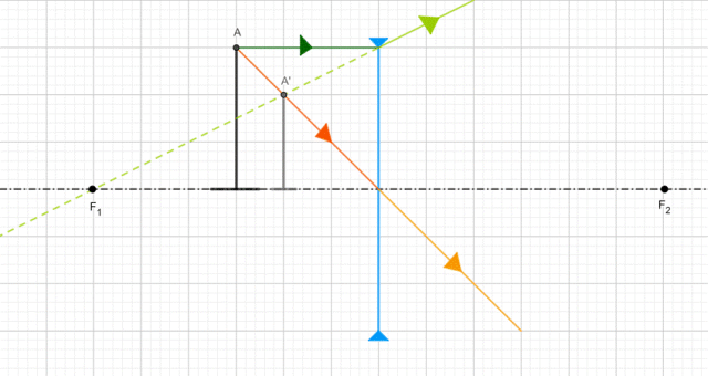 Aby wyznaczyć obraz gwoździa z jej wierzchołka, prowadzimy dwa promienie. Pierwszy biegnie równolegle do osi optycznej, a po załamaniu biegnie tak, że jego przedłużenie przechodzi przez ognisko pozorne. Drugi biegnie przez środek soczewki, nie ulegając załamaniu. Punkt przecięcia tych promieni wyznacza obraz wierzchołka gwoździa (A’).