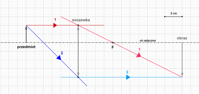 Odległość soczewki od przedmiotu wynosi 6 kratek, gdzie każda kratka odpowiada 1 cm. Ogniskowa to odległość ogniska (F) od soczewki wynosząca 4 kratki.