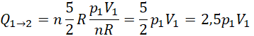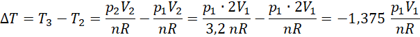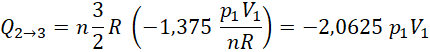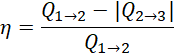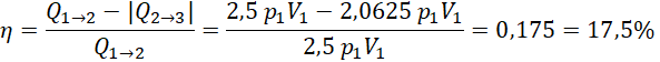 Zapisujemy wzór na sprawność silnika wiedząc, że ciepło nie jest wymieniane z otoczeniem w przemianie adiabatycznej. Obliczamy wartości ciepła w pozostałych dwóch przemianach i podstawiamy do głównego wzoru.