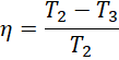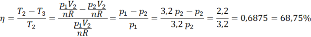 Najwyższą temperaturą w przemianie jest temperatura w punkcie 2, a najniższą w punkcie 3. Na podstawie równania Clapeyrona obliczamy te temperatury i wstawiamy wartości do wzoru na sprawność silnika idealnego.