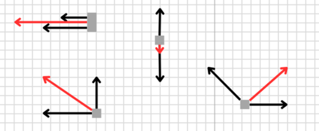 Znajdź taką siłę, która w sumie z siłami narysowanymi da 0. W pierwszym przypadku będzie ona skierowana w prawo i będzie miała wartość sumy dwóch sił. W drugim przypadku sił będzie skierowana w górę i będzie miała wartość różnicy sił. W trzecim i czwartym przypadku wektor musi być skierowany przeciwnie do siły wypadkowej i musi mieć tę samą długość co ona.