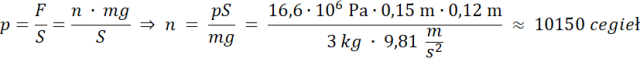 Korzystamy ze wzoru na ciśnienie, siła nacisku jest równa sile ciężkości cegły pomnożonej przez liczbę cegieł. Przekształcamy wzór, tak by obliczyć liczbę cegieł i podstawiamy wartości. Wysokość wieży jest równa liczbie cegieł razy wysokość jednej cegły.