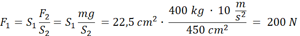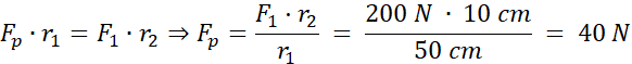 Korzystamy ze wzoru na ciśnienie i prawa Pascala – ciśnienie jest takie samo w całej objętości cieczy. Następnie korzystamy równości momentów sił – iloczyny siły, odległości od punktu odniesienia oraz sinusa kąta pomiędzy nimi (u nas sin(90o) = 1) muszą być równe dla obu sił.