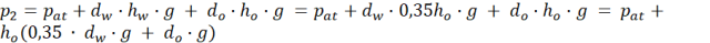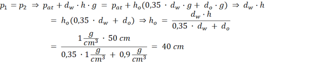 Obliczamy ciśnienie na tym samym poziomie (dno rurki) w obu ramionach rurki i zauważamy, że zgodnie z warunkiem równowagi cieczy w naczyniach połączonych ciśnienia te są sobie równe. Korzystamy z zależności pomiędzy wysokościami wody i oleju, żeby wyznaczyć wysokość oleju.