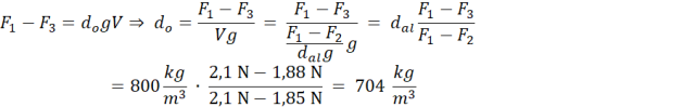 Korzystamy ze wzoru na siłę wyporu i faktu, że utracony przez zanurzenie ciężar jest równy sile wyporu alkoholu. Przyrównujemy do siebie wzory i wyznaczamy objętość ciężarka. Analogicznie wyznaczamy siłę wyporu oleju i wyznaczamy gęstość oleju.