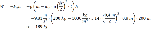 W tym zadaniu oblicz pracę wykonaną przez siłę naciągu podczas opuszczania batyskafu o długości l = 0,8 m, średnicy śr = 0,4 m i masie m = 200 kg od momentu pełnego zanurzenia batyskafu do osiągnięcia głębokości 200 m nad jego kadłubem. Średnia gęstość wody morskiej to