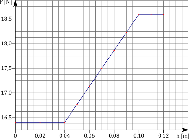 W tym zadaniu sporządź wykres zależności siły, jaką wskazuje siłomierz, od wysokości dolnej podstawy sześcianu nad dnem naczynia F(h) i na jego podstawie wyznacz gęstość cieczy, masę sześcianu o boku b = 6 cm i maksymalną siłę wyporu. Naczynie wypełnione jest cieczą na wysokość H = 10 cm, a wyniki pomiarów są następujące: h = 2 cm – F = 16,42 N; h = 4 cm – F = 16,42 N; h = 5 cm – F = 16,78 N; h = 6 cm – F = 17,14 N; h = 7 cm – F = 17,50 N; h = 8 cm – F = 17,87 N; h = 9 cm – F = 18,22 N; h = 10 cm – F = 18,58 N; h = 11 cm – F = 18,58 N; h = 12 cm – F = 18,58 N. Do sporządzenia wykresu możesz użyć arkusza kalkulacyjnego.
