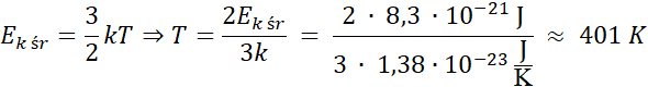 Korzystamy ze wzoru na średnią energię kinetyczną ruchu postępowego cząsteczek, temperaturę wyrażamy w skali Celsjusza zgodnie z zależnością