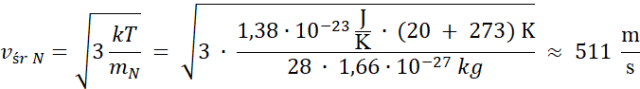 W tym zadaniu oblicz prędkość średnią ruchu postępowego cząsteczek azotu oraz iloraz prędkości średnich ruchu postępowego cząsteczek azotu i cząsteczek tlenu w temperaturze TC = 20oC. Przyjmij masę cząsteczki azotu N2: