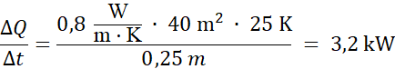W tym zadaniu oblicz szybkość przewodzenia ciepła przez jedną ze ścian budynku o grubości d = 25 cm, powierzchni S = 40 m2i współczynniku przewodnictwa cieplnego