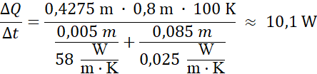 Korzystamy ze wzoru na szybkość przepływu ciepła przez dwie warstwy o różnych współczynnikach przewodnictwa cieplnego i różnych grubościach. Różnica temperatur w stopniach Celsjusza jest taka sama jak w kelwinach.