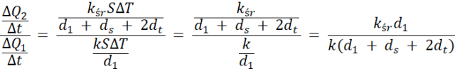 Korzystamy ze wzoru na szybkość przewodzenia ciepła. Wyznaczamy iloraz szybkości, powierzchnia i różnica temperatur są takie same w obu przypadkach, więc możemy je skrócić.