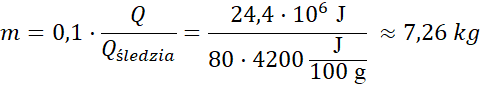 Dzielimy ciepło tracone przez fokę przez wartość kaloryczną 100 g ryby i mnożymy razy 0,1, żeby otrzymać wynik w kilogramach. 1 kcal = 4200 J.