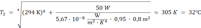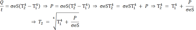 W tym zadaniu oblicz temperaturę, na jaką ustawiono termostat grzejnika o powierzchni S = 0,8 m2 i mocy P = 50 W, jeśli w pomieszczeniu panuje stała temperatura T1 = 21oC, a współczynnik emisji dla grzejnika i pozostałych ciał wypełniających pomieszczenie wynosi e = 0,95. Przyjmij wartość stałej Stefana-Boltzmanna