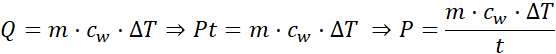Praca wykonana przez grzałkę jest równa ciepłu dostarczonemu do wody. Korzystamy ze wzoru na ilość ciepła potrzebnego do zmiany temperatury ciała o