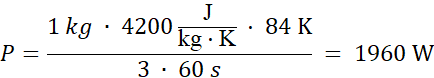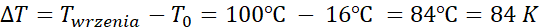 W tym zadaniu oblicz moc grzałki czajnika, w którym woda o masie m = 1 kg i temperaturze T0 = 16oC pogrzano do temperatury wrzenia w t = 3 min. Ciepło właściwe wody to