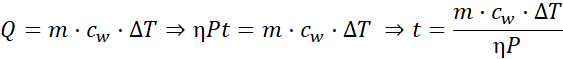 Ciepło pobrane przez wodę jest równe pracy wykonanej przez grzałkę razy sprawność urządzenia. Korzystamy ze wzoru na ilość ciepła potrzebnego do zmiany temperatury ciała o
