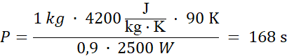 W tym zadaniu oblicz czas potrzebny na zgotowanie 1 l wody o temperaturze początkowej T1 = 10oC w czajniku elektrycznym o mocy P = 2,5 kW i sprawności