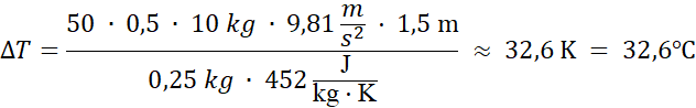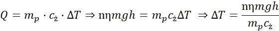 Z zasady zachowania energii energia kinetyczna młota w momencie uderzenia jest równa jego energii potencjalnej przed uderzeniem. Korzystamy ze wzoru na ilość ciepła potrzebnego do zmiany temperatury ciała o