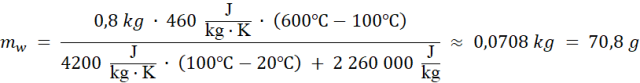 W tym zadaniu oblicz masę wody, która wyparowała po wrzuceniu żelaznej podkowy o masie m = 0,8 kg i temperaturze T2 = 600oC, jeśli woda miała początkowo temperaturę T1 = 20oC, a ciepło właściwe żelaza to