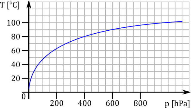 Z wykresu zależności p(h) odczytujemy, że na wysokości 7000 m n.p.m. panuje ciśnienie 400 hPa, a następnie z wykresu zależności T(p), że dla ciśnienia 400 hPa temperatura wrzenia wynosi Tw = 80oC.