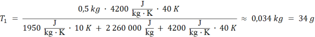 W tym zadaniu oblicz masę pary wodnej o temperaturze początkowej T2 = 110oC, jeśli po wtłoczeniu jej do zbiornika z wodą o masie m1 = 0,5 kg i temperaturze T1 = 20oC temperatura ustaliła się na poziomie T = 60oC. Przyjmij ciepło właściwe pary wodnej