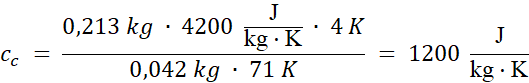 W tym zadaniu oblicz ciepło właściwe ciała stałego o masie mc = 42 g i temperaturze początkowej Tc = 98oC wrzuconego do wody o masie mw = 213 g i temperaturze początkowej Tw = 23oC, jeśli temperatura ustabilizowała się na poziomie Tk = 27oC.