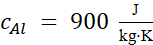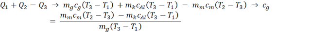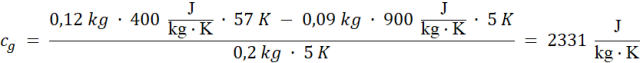 W tym zadaniu oblicz ciepło właściwe gliceryny o masie mg = 200 g i temperaturze początkowej T1 = 18oC, do której wrzucono kawałek mosiądzu o masie mm = 120 g i temperaturze T2 = 80oC, jeśli temperatura ustabilizowała się na poziomie T3 = 23oC. Uwzględnij aluminiowy kalorymetr o masie mk = 90 g. Przyjmij ciepło właściwe mosiądzu