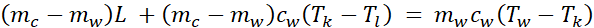 W tym zadaniu ułóż równanie bilansu cieplnego dla lodu o temperaturze początkowej Tl = 0oC wrzuconego do wody o masie mw = 140 g i temperaturze początkowej Tw = 47oC, jeśli temperatura ustabilizowała się na poziomie Tk = 15oC, a całkowita masa wody po roztopieniu lodu wyniosła mc = 188 g.