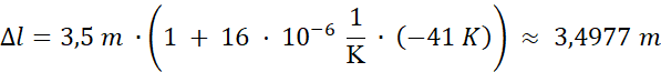 W tym zadaniu oblicz długość stalowej poręczy o początkowej długości l = 3,5 m, jeśli temperatura spadła z T1 = 28oC do T2 = -13oC. Przyjmij współczynnik rozszerzalności liniowej dla stali