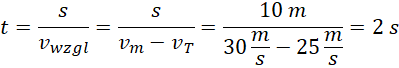 W czasie wyprzedzania obliczamy prędkość względną motocyklisty w odniesieniu do TIR-a. Nadwyżka prędkości względem TIR-a pozwala motocykliście przebyć drogę większą o długość TIR-a w tym samym czasie.